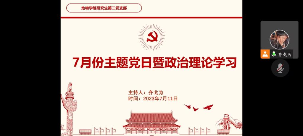 (通讯员 赵晴)7月11日下午2点30分,地物学院研究生第二党支部采用腾讯会议的方式开展了7月支部主题党日活动,本次活动由支部党员齐戈为同志主持。