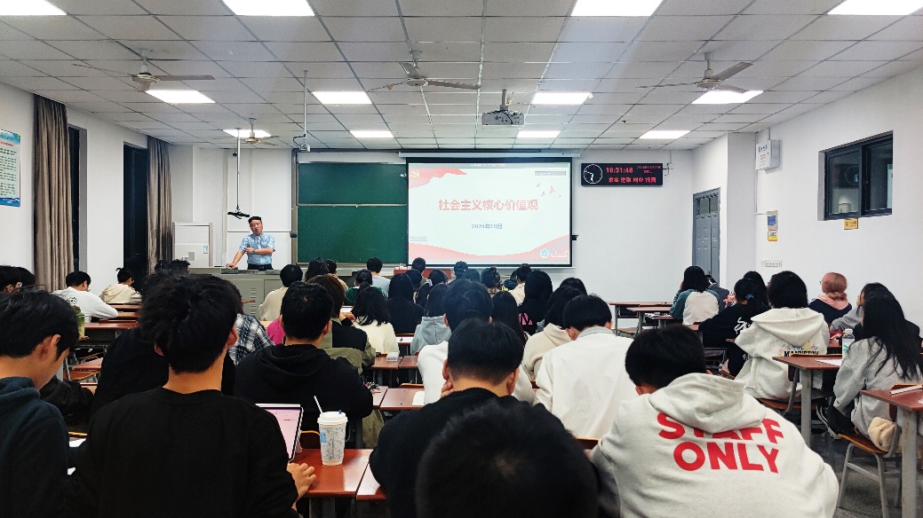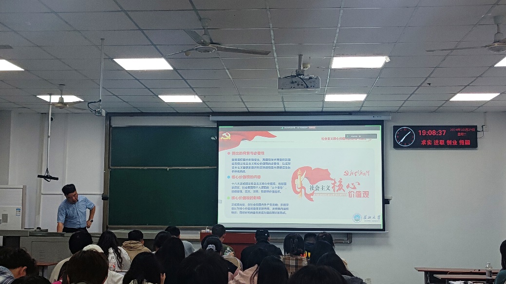 (通讯员 游菁)10月29日,地物学院联合传媒学院、资环学院分党校在武教A108开展2024年下半年入党积极分子、发展对象集中授课。地物学院党委书记周俊以“社会主义核心价值观”为题讲授党课。
