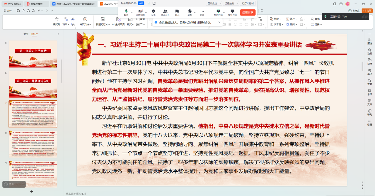 理论学习环节,集中学习了习近平总书记重要讲话和重要指示批示精神:“习近平在中共中央政治局第二十一次集体学习时强调 坚持从抓作风入手推进全面从严治党 把新时代党的自我革命要求进一步落实到位”“习近平在山西考察时强调 努力在推动资源型经济转型发展上迈出新步伐 奋力谱写三晋大地推进中国式现代化新篇章”;深入贯彻中央八项规定精神学习教育相关内容:“石泰峰同志在党的十八大以来深入贯彻中央八项规定精神的成效和经验交流研讨座谈会上的讲话”“王忠林在省委党的建设工作领导小组(扩大)会议上强调‘七查七看’扎实开展学习教育‘回头看’动真碰硬 坚决把查摆问题改彻底治到位”“省委常委会召开学习教育查摆问题情况检视交流会 切实增强深查实改坚定自觉 推动学习教育取得更大成效 王忠林主持并作总结讲话”“王忠林到荆州调研并主持召开座谈会时强调 坚定信心 加压奋进 努力当好江汉平原高质量发展排头兵”“云南省曲靖市统计造假、政治生态恶化的典型案例”“湖北省委学习教育工作专班 省纪委办公厅 关于黄冈市蕲春县7名党员干部在学习教育期间违规吃喝严重违反中央八项规定精神问题的通报”“湖北省委学习教育工作专班 省纪委办公厅 关于江陵农村商业银行3名管理人员在学习教育期间违规吃喝严重违反中央八项规定精神问题的通报”“中共湖北省委深入贯彻中央八项规定精神学习教育工作专班 中共湖北省纪委办公厅关于7起党员干部、公职人员酒驾醉驾典型问题的通报”;学校会议精神:“坚定信心决心 铆足干劲拼劲 学校召开2025年暑期工作部署会”“锚定一流目标 建功支点建设 王建平讲授‘七一’专题党课”等。