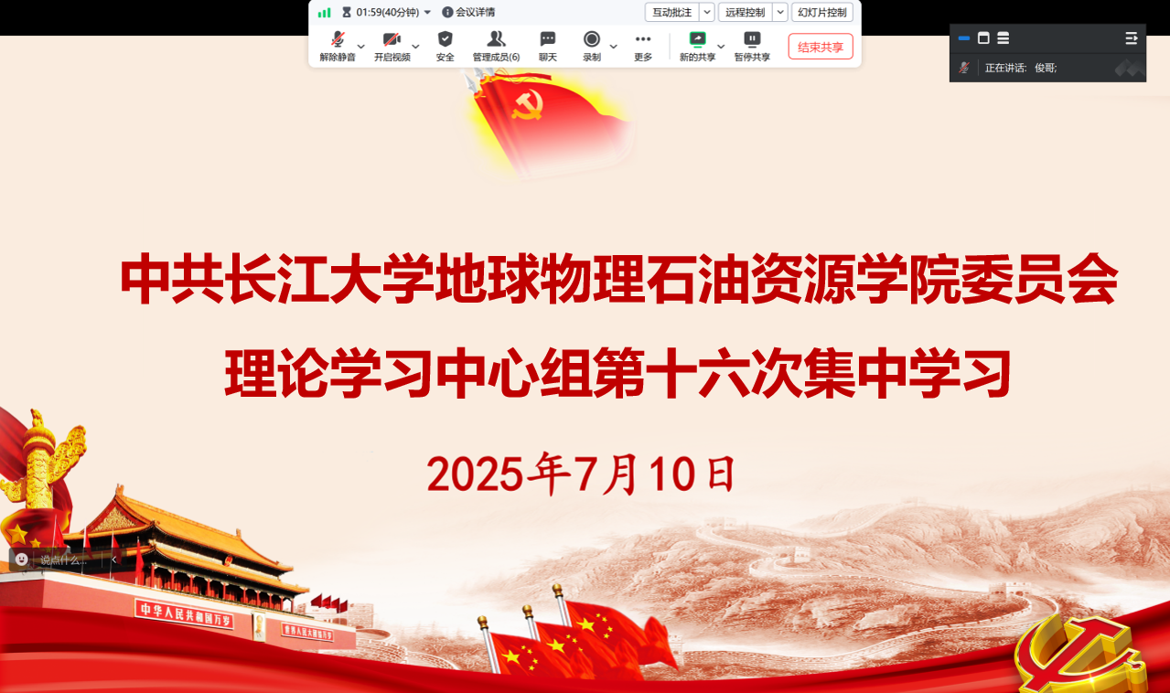 (通讯员 游菁)7月10日下午,地物学院党委中心组在线上组织开展了2025年第十六次集中学习和研讨,院党委书记周俊主持会议。