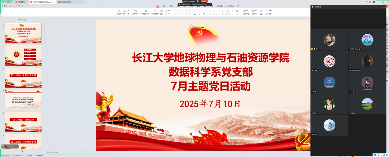 (通讯员 游菁)7月9日至10日,地物学院各教工党支部先后开展了7月支部主题党日活动,各教工党支部全体党员参加活动,会议由各教工党支部书记主持。
