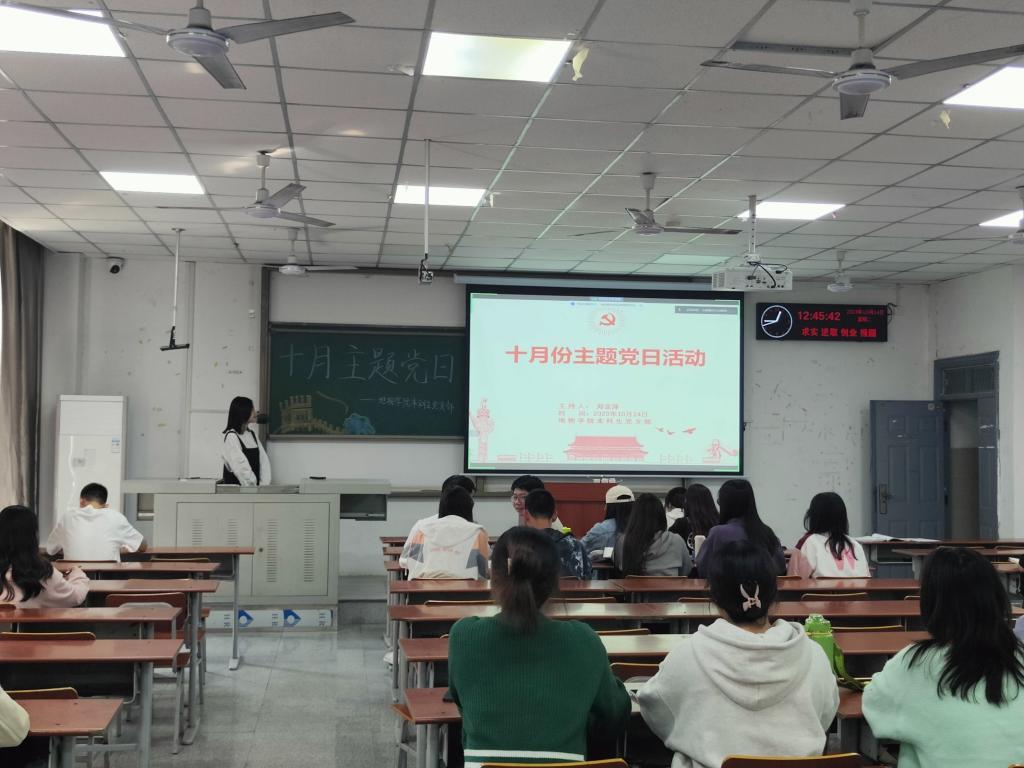 (通讯员 曾阳)为了进一步学习贯彻习近平新时代中国特色社会主义思想,地物学院本科生党支部于2023年10月24日中午12时30分于A103开展10月主题党日活动,本科生党支部全体党员共同参与了此次活动,会议由党支部书记董勤文同志主持。