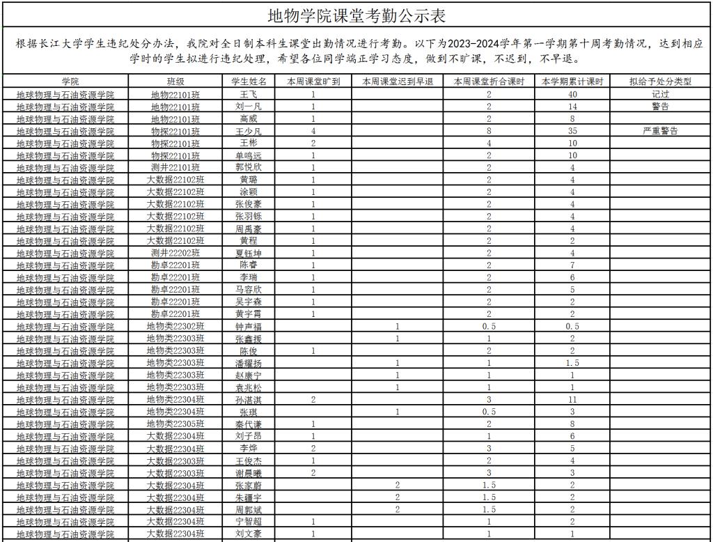 我院对全日制本科生课堂出勤情况进行考勤。以下为2023-2024学年第一学期第十周考勤情况,根据《长江大学学生违纪处分办法》,达到相应纪律处分学时的学生拟进行违纪处理。希望各位同学端正学习态度,做到不旷课,不迟到,不早退。