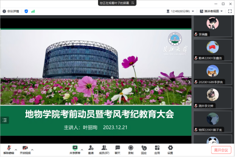 (通讯员 李瀚霖)为考生助力梦想,为梦想插上翅膀。为了帮助我院考生更充分地熟悉研考流程,牢记研考相关纪律规定,12月21日上午9:30,学院2024年研考指导暨考风考纪教育大会通过腾讯会议顺利召开。本次会议由地物学院团委书记、大四年级辅导员叶丽珣主讲。