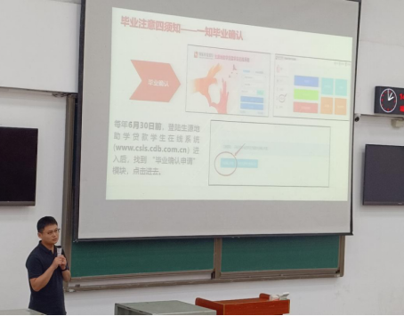 活动伊始,围绕“诚信感恩教育”主题,何忠万就生源地贷款还款、个人征信应用、离校后可能遇到的相关问题等进行了详细讲解,重点强调了个人财产安全、信息安全、防电信诈骗等问题,现场解答了同学们的疑问,并给即将离校的毕业生们送上了美好的毕业祝福。