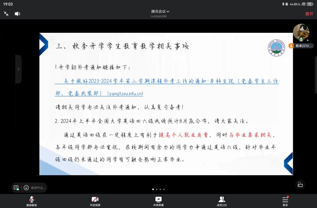 即将迈入新学期,班主任向同学们介绍了秋季学期开学相关教学安排,包括开学初的补考安排和全国大学英语四级考试等相关信息。