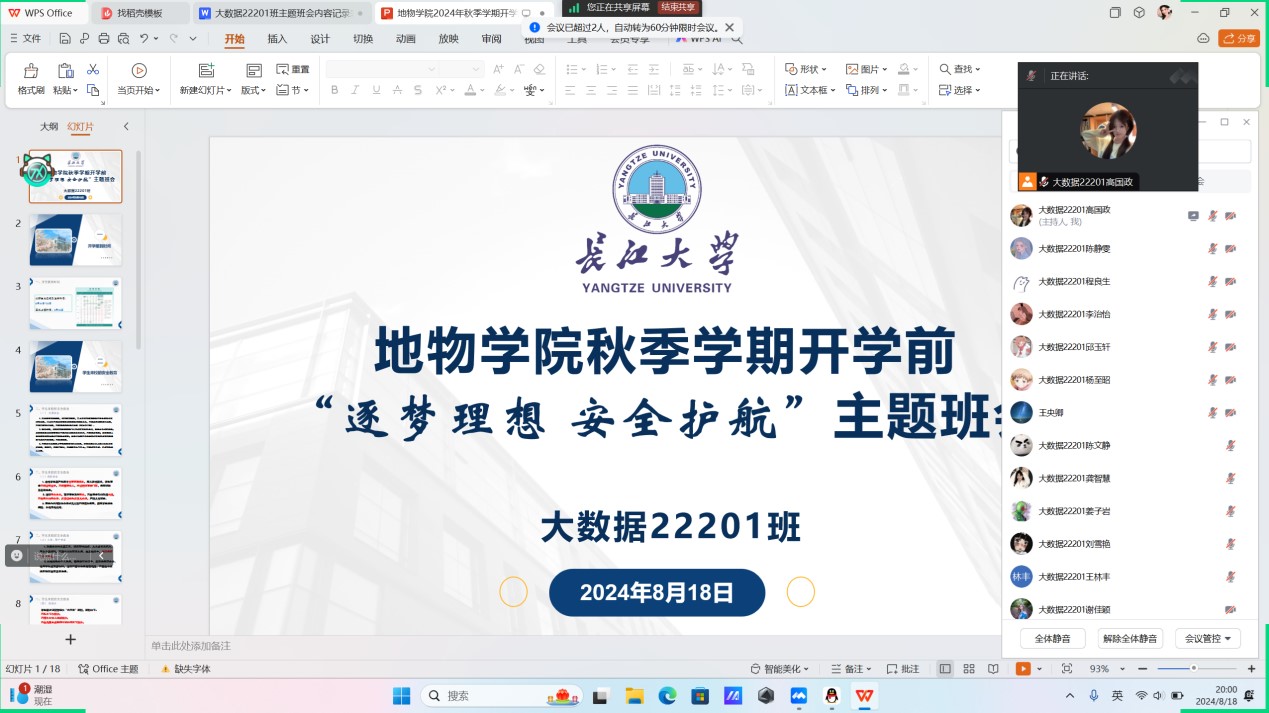 (通讯员 罗焯文 贾明勋 张雪凯)九月再临,五湖四海的同学不久又将重聚一堂,再会书香校园。为确保我院秋季学期开学工作平稳有序,学院各班级于8月17日至8月20日线上组织开展了“逐梦理想 安全护航”主题班会。