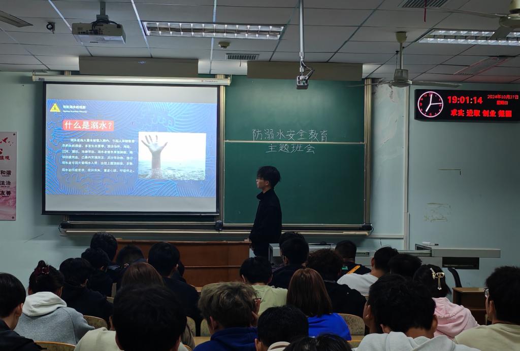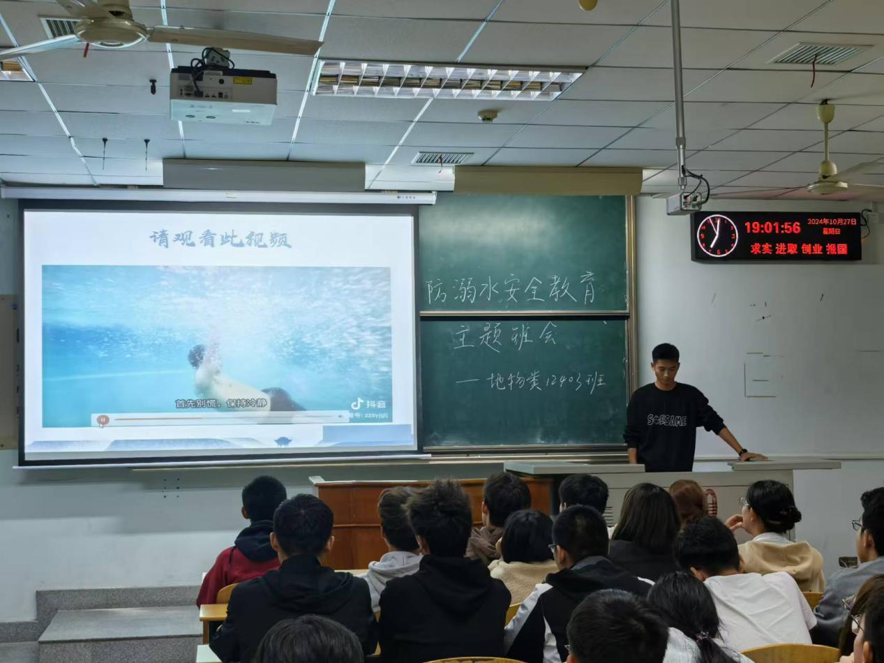 (通讯员 纪皓楠 范嘉颖 方俊怡)为提高学生防溺水安全意识,增强自我保护能力,避免溺水事故发生,地物学院于10月27日晚组织2024级新生开展防溺水安全教育主题班会,班会由各班副班长兼安全委员主持。