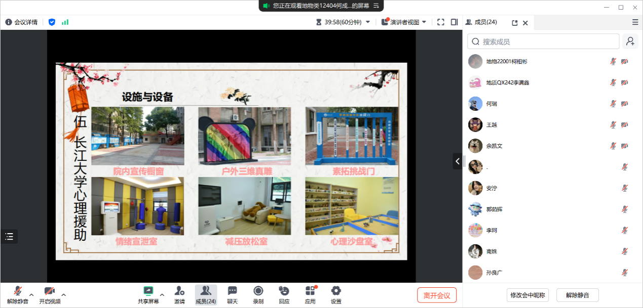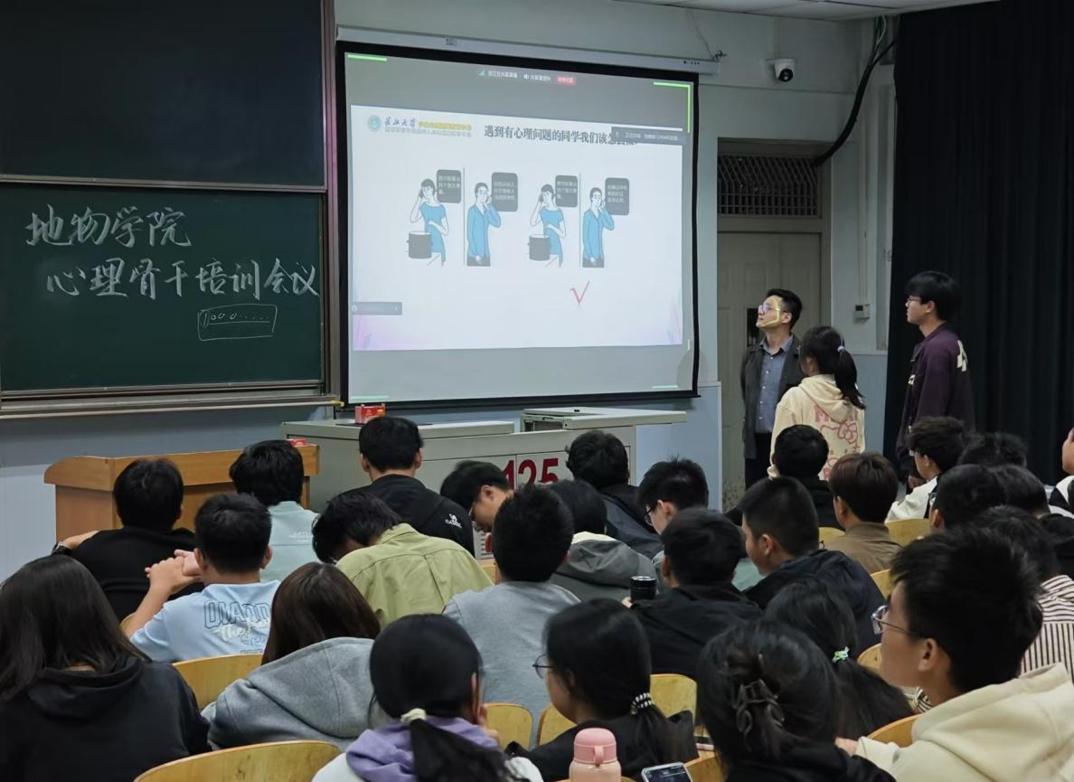 (通讯员 何香谊 徐语何)为帮助2024级新生适应大学生活,激活校园危机预警网络,提升新生骨干自助助人能力,地物学院于11月6日晚6:30在荆州东校区13教D125(24级研究生线上参会)开展以《心理健康与心理咨询》为主题的秋季学生心理骨干培训,学院心理专干何忠万主讲,学院2024级学生干部参会。