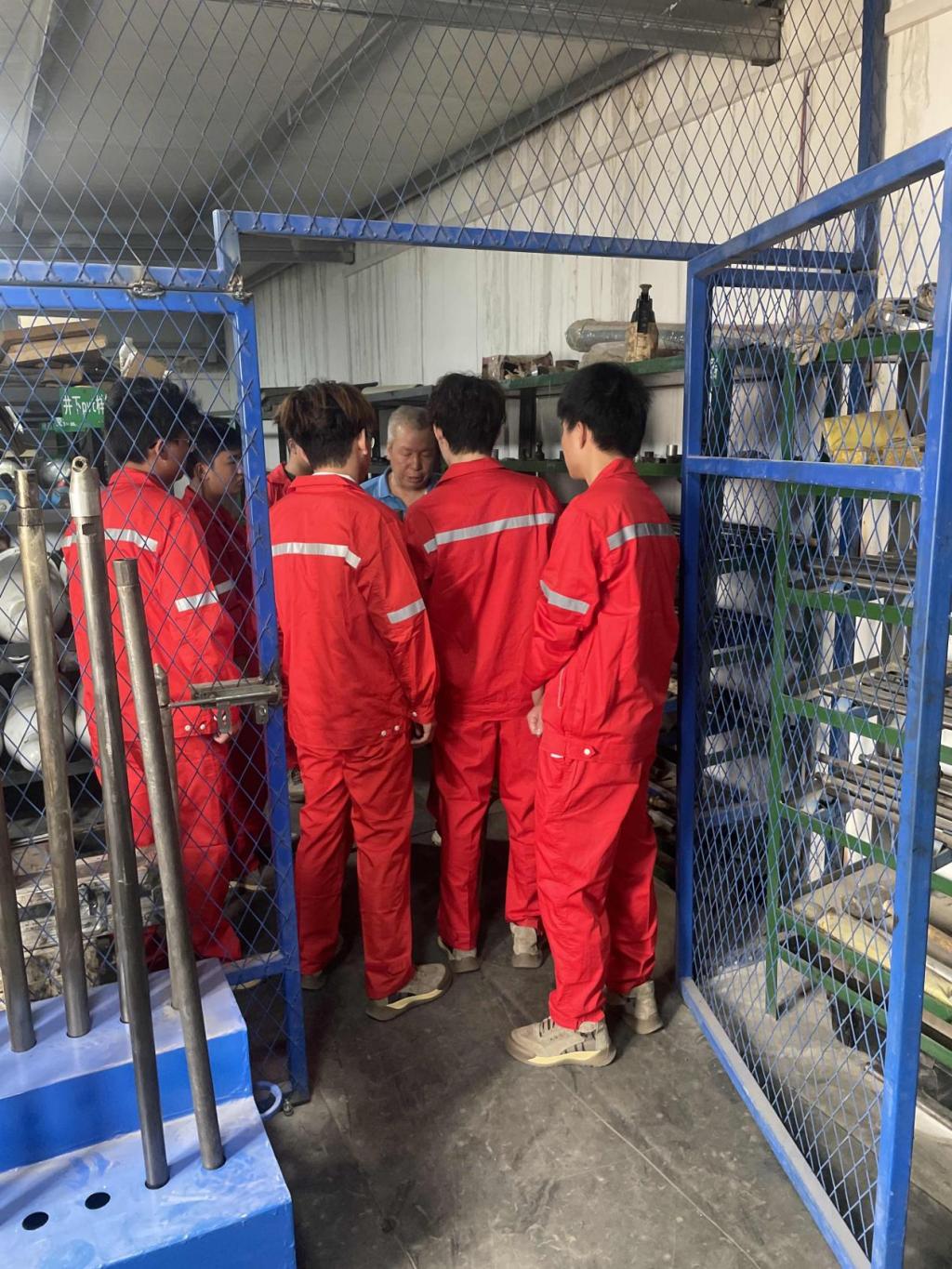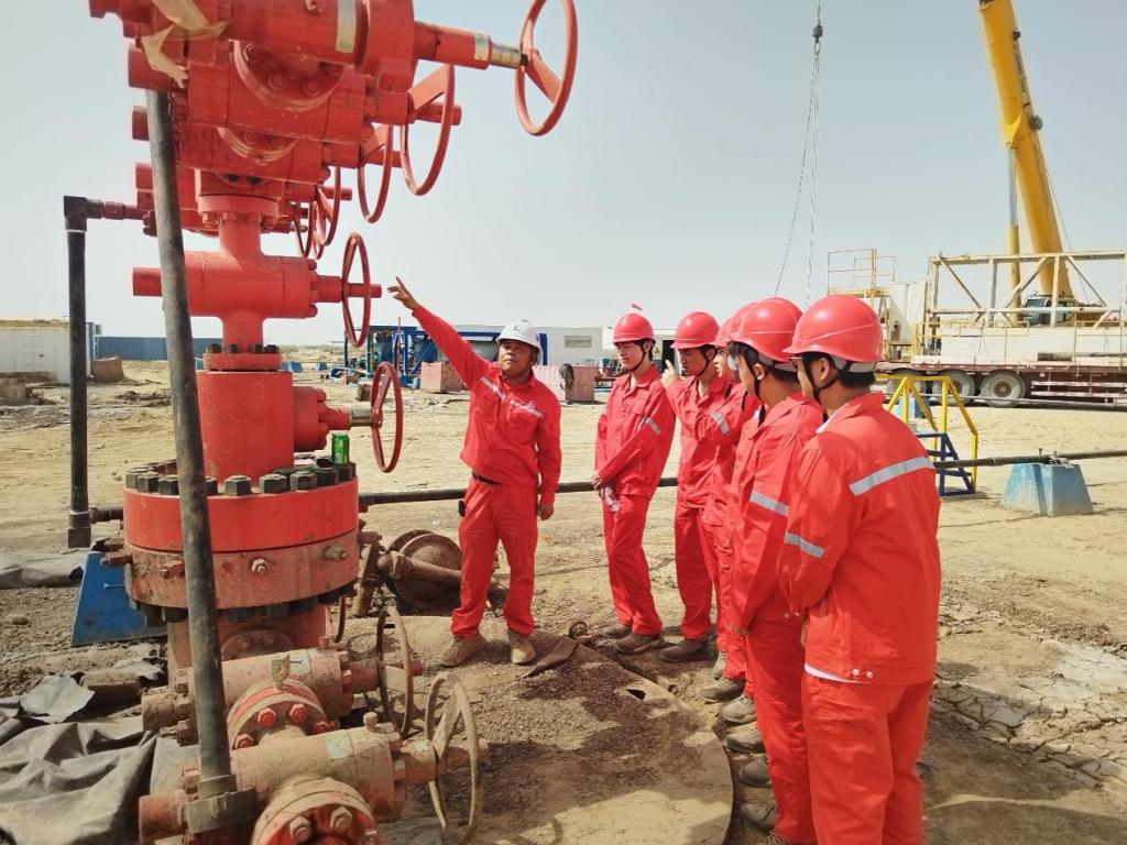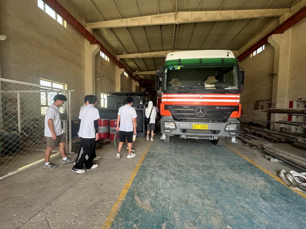 7月30日,同学们开始正式实习,在接受系统的现场安全培训后正式进入生产线。同学们跟随技术人员学习油田现场作业流程以及各个环节所用设备的工作原理、使用方法,学习常见仪器(如压力机、持水率计、60臂井径仪等)的编程、组装、投捞、维护工作基本原理,油气的管道仪器处理及装罐运输操作等等,让大家深入了解石油开采的步骤和设备仪器的操作方法。