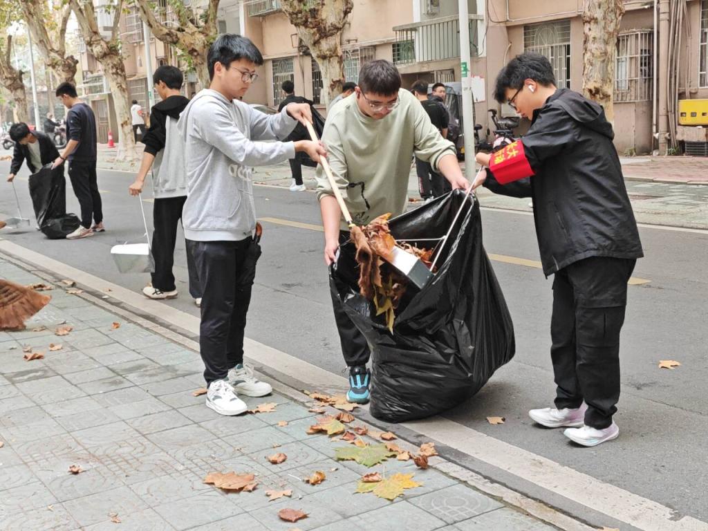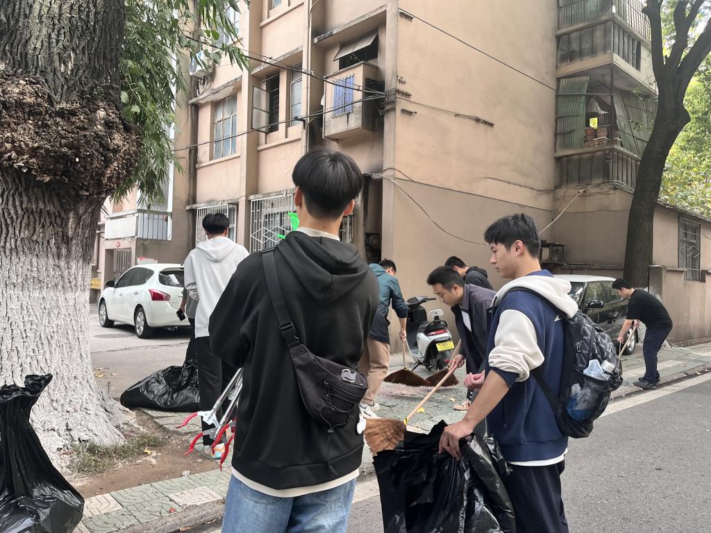 在谭辰阳的带领下,37名同学被分成三个小组,对东校区东二门右手边三栋成套公寓周边区域进行地面落叶清扫、垃圾清理、卫生死角清理等工作。