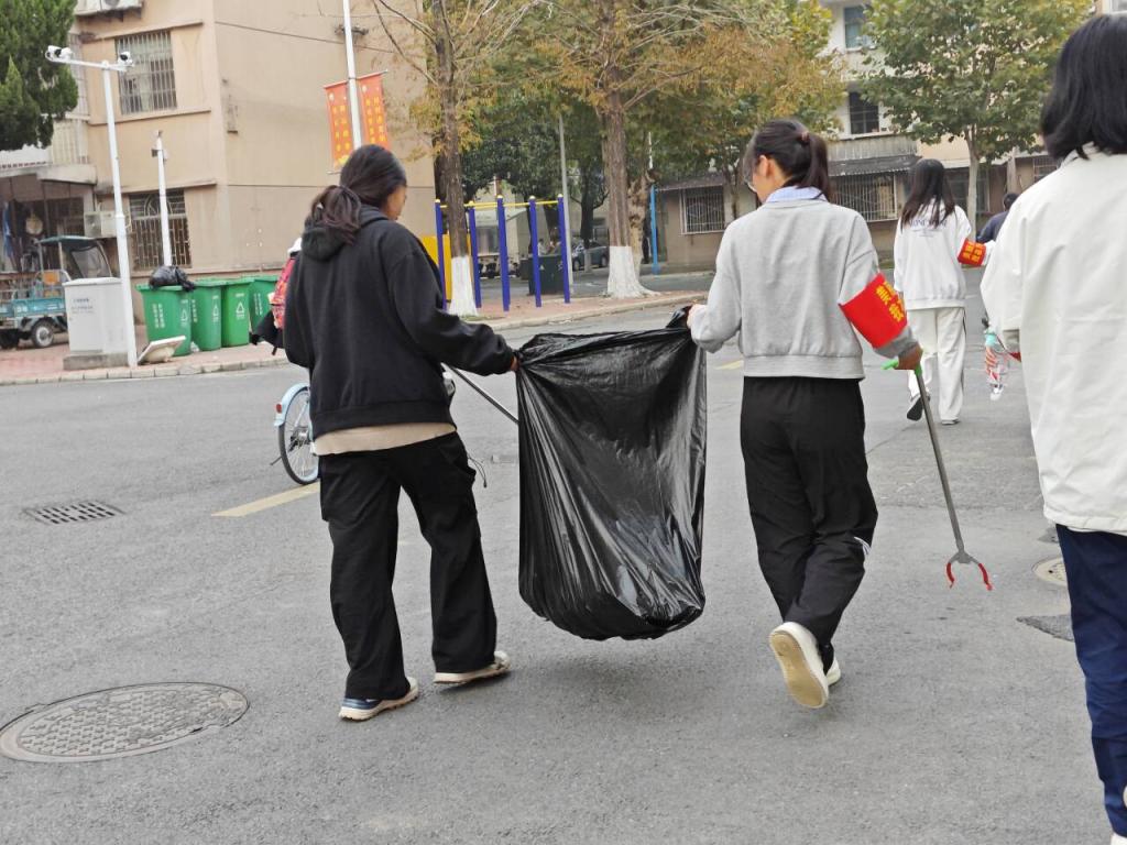 各组成员分工明确,女生负责用垃圾夹清理草坪上的细小纸屑,男生负责使用扫帚清扫路面落叶和垃圾的集中收集处理。三个小组互帮互助,通过协调劳动工具、协调小组成员等形式大大提高了劳动效率。