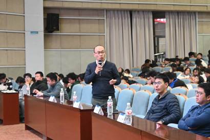 在交流提问环节,张威和李赋斌两位校友与现场同学们进行了热烈的互动。他们耐心解答了同学们关于大学生兴趣爱好的培养、专业知识应用、职业规划等方面的问题,并分享了自己的见解和建议。