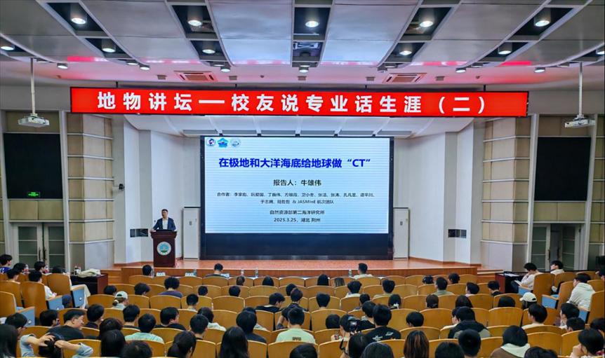 (通讯员 张志凝 纪皓楠 罗滢滢)3月25日晚,我院地球物理学2004级校友、自然资源部第二海洋研究所研究员牛雄伟应邀做客地物讲坛“校友说专业话生涯”第二讲,在东校区12教405报告厅作题为“在极地与大洋海底为地球做‘CT’”的主题报告。学院固体地球物理系主任周磊,2024级辅导员谭辰阳,340余名2024级本科生参加报告会。报告会由学院党委副书记焦简金主持。