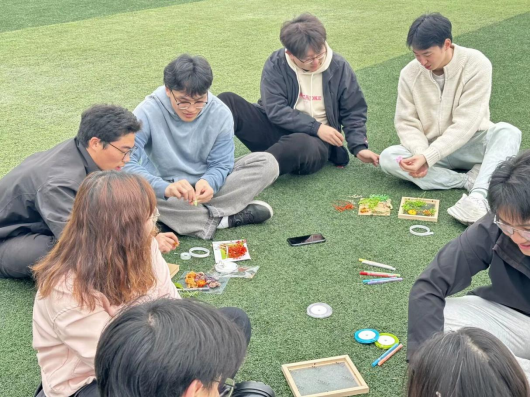 在铺展如茵的画框木板之上,同学们用丙烯颜料与马克笔进行色彩涂鸦。活动现场,大家全情投入,按各自风格创作。有的先以马克笔勾勒,有的直接用丙烯颜料上色。完成涂鸦后,大家将精心挑选的植物标本融入画面,使标本与画作巧妙结合,赋予标本别样魅力。