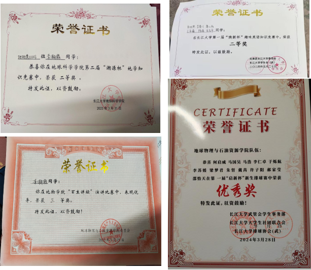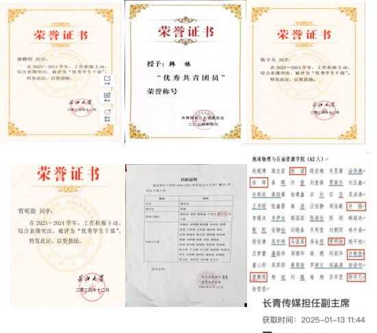 在个人与集体的共同努力下,物探22201团支部打造了一个充满活力的团支部。其中王采薇同学以卓越表现荣获长江大学第十九届万人创百星“学习之星”。陈诺同学在2023年全国大学生英语竞赛上荣获一等奖,同时在2023年“外研社·国才杯”全国大学生外语能力大赛摘得三等奖。马国昊同学以其出色的表现获得第十七届中国大学生计算机设计大赛三等奖,同时荣获第十五届中国大学生服务外包创新创业大赛三等奖。周翔第十六届大学生数学竞赛(非数学A类)三等奖。肖强同学湖北省青年志愿公益项目大赛铜奖。在集体荣誉方面,物探22201团支部在2023年度荣获地物学院“活力团支部”的荣誉称号,并获评2023——2024学年“标兵班集体”荣誉称号。