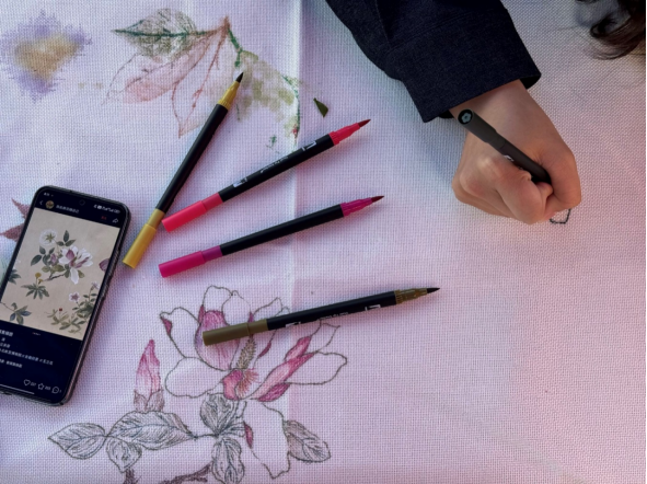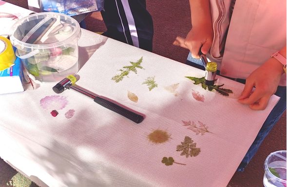 同学们满怀期待,将寻觅而来的花草树叶,轻轻浸没在盛有明矾稀释液的小桶中,让每一片自然的馈赠都充分浸润其中。随后,大家拿起胶带,小心翼翼地将花材固定在洁白的桌布上,仿佛在搭建一座通往自然艺术的桥梁。紧接着,同学们手持拓染小锤,一下又一下,轻柔且富有节奏地敲击着树叶。在这细微而持续的力量下,树叶的轮廓逐渐清晰,完美地印刻在桌布之上,像是留下了春天的专属印记。