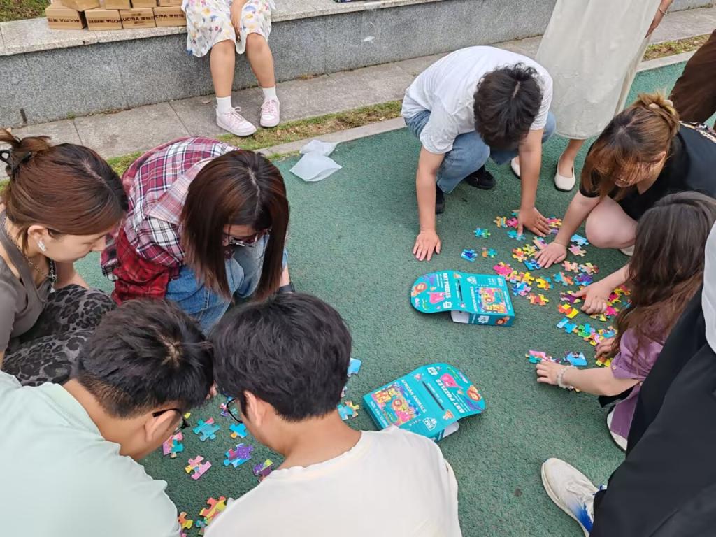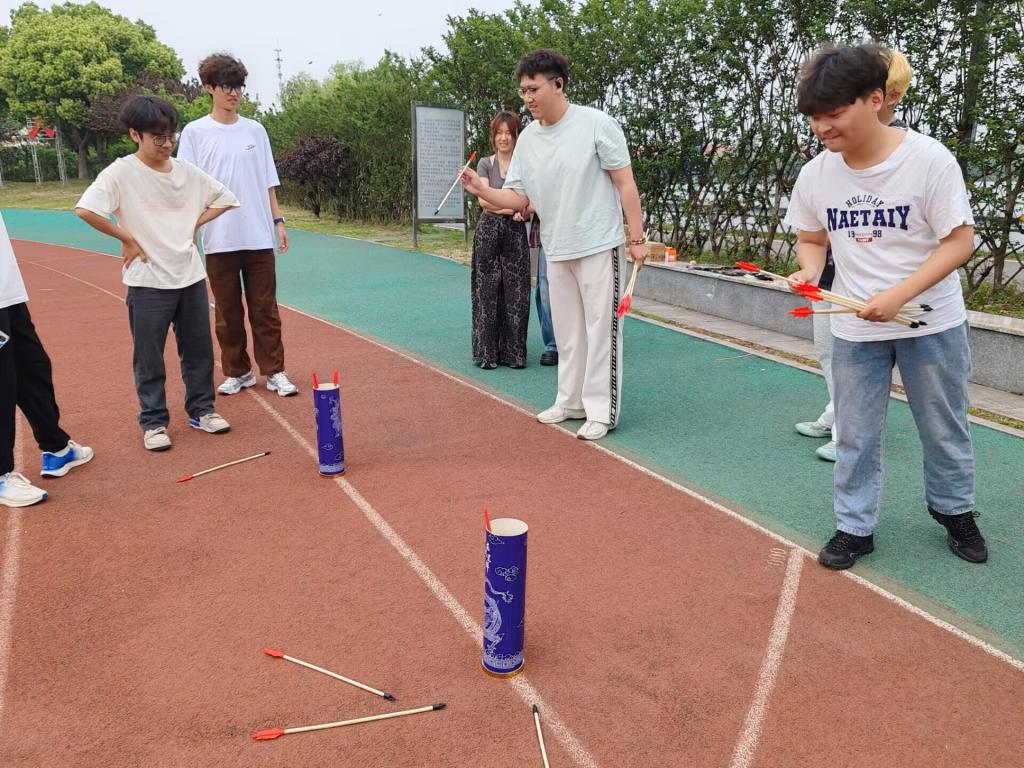 活动现场设置了投壶、飞镖、拼图和跳绳四个趣味闯关项目。参与者随机组队,在春日的暖阳下展开了一场别开生面的团队竞技。飞镖区热闹非凡,大家各自发散自己的想象,以各种天马行空的姿势进行瞄准、投掷,每当飞镖命中靶心,现场就会爆发出热烈的喝彩声。投壶区内,同学们屏息凝神,手持木箭反复调整角度。"中了!"随着一声欢呼,箭矢稳稳落入壶中,引来阵阵掌声。跳绳区洋溢着青春的活力,队友们在一旁加油助威。拼图区考验着团队的默契配合,队员们分工协作,有的负责寻找边缘拼块,有的专注拼接主体图案,不时交流着拼图心得,活动也在同学们的欢声笑语中圆满结束。