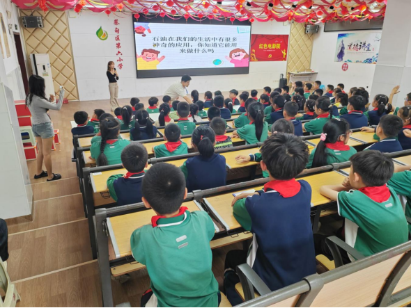 在“地球宝藏大发现”环节,志愿者通过实物标本展示和情景模拟,带领学生认识水资源、矿物资源和能源矿产。“石油不仅能让汽车跑起来,还能变成你们手中的塑料玩具”。 当主讲人武凌帆将汽油样品与塑料模型对比展示时,孩子们纷纷凑近观察。互动实验 “模拟石油开采” 更是将课堂气氛推向高潮,学生们分组操作简易抽油机模型,直观感受资源勘探的科学原理。