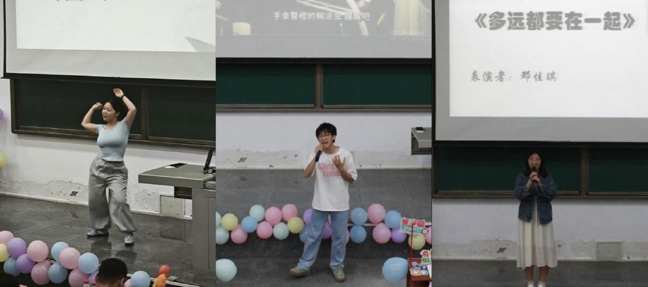 步入活动现场,五彩斑斓的气球、精心设计的主题横幅与柔和温馨的灯光相互映衬,将浓浓的毕业氛围渲染得淋漓尽致。随着刘晓春同学活力四射的独舞《Mantra》惊艳亮相,欢送会正式拉开帷幕,瞬间点燃全场热情。歌曲翻唱《我用什么把你留住》,深情演唱搭配青年运动时期工人阶级的呐喊声,激荡起在场师生炽热的报国情怀;邓佳琪同学带来的《多远都要在一起》,用歌声传递出母校与师生间跨越山海的深厚联结。
