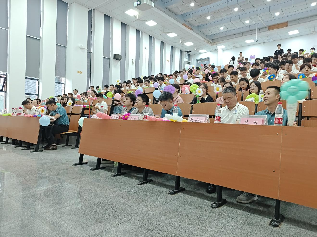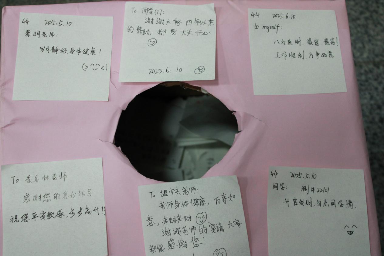 欢送会上,焦简金代表学院向全体毕业生致以诚挚祝福。他深情寄语,希望同学们永远保持地物人特有的韧劲与闯劲,在祖国最需要的地方扎根成长、发光发热,衷心祝愿毕业生们前程似锦、一生璀璨。活动特设的“星星祝福”环节成为一大亮点,毕业生们在信纸上书写对同窗、恩师的不舍眷恋,以及对未来的美好期许,并将这份珍贵情谊精心封存,留作专属纪念。