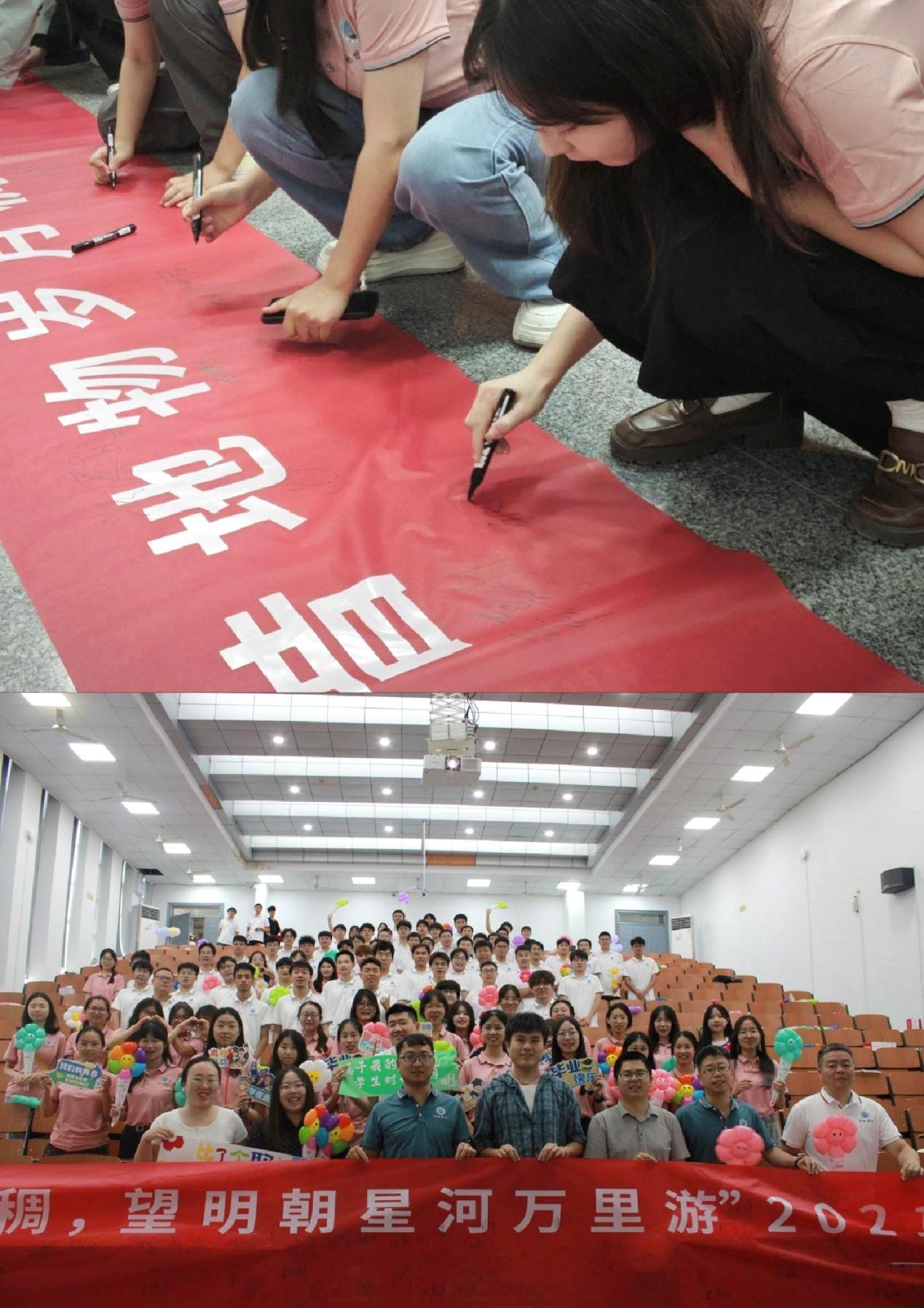 为增添欢乐氛围,“听歌识曲”“数字炸弹”等趣味互动游戏轮番登场,师生同台竞技,现场欢声笑语不断。两轮来自学弟学妹的惊喜祝福视频,既有幽默诙谐的调侃,更饱含暖心鼓励。在压轴环节,全体毕业生齐声合唱《我们的明天》,用歌声许下“未来再见”的美好约定,将活动氛围推向高潮。最后,毕业生们在主题横幅上郑重签名,并与师友合影留念,将青春笑颜定格在这难忘时刻。