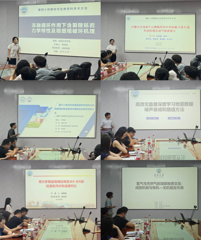 活动中,六位主讲人依次分享了其研究领域的最新进展。黄婉滢以《冻融循环下含裂隙砾岩力学特性及多尺度破坏机理》为题,深入探究含裂隙砾岩力学特征及微观破坏机理,为寒区工程安全设计提供重要理论支撑;何一鸣结合内蒙古乌海地区典型地质特征,剖析《内蒙古乌海桌子山奥陶系拉什仲组重力流水道形成机理及油气地质意义》;林贵蓝带来《基于小波与空间通道卷积协同优化双流网络的电成像测井图像空白条带修复方法》,为测井智能化处理开辟全新技术路径;李安禹作《高效无监督深度学习的地震数据噪声衰减和插值方法》报告,提出无需标签数据即可实现高精度噪声抑制与数据恢复的创新算法;汤思维分享《鄂尔多斯盆地靖边地区长8-长6段烃源岩评价和油源对比》,深入探讨鄂尔多斯盆地靖边地区油气成因及源储配置关系;肖宇带来《氢气与天然气的深部地质交互:成因机制与有机—无机相互作用》,从多源数据出发,探究氢气与天然气在深部地层的协同演化与转化机制,推动非常规能源研究迈向新方向。