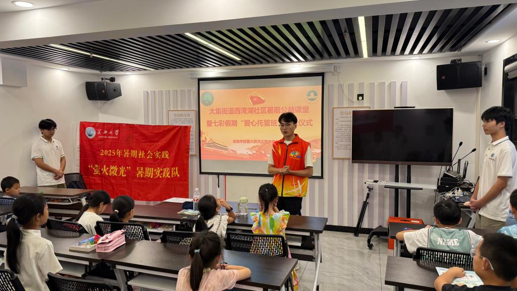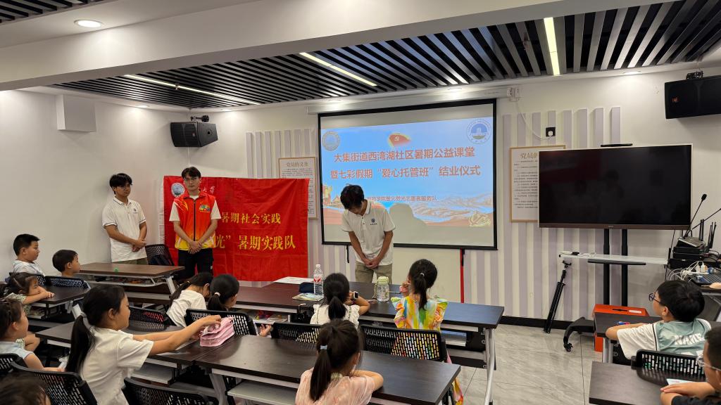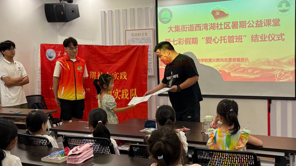 (通讯员 林中枭)地物学院萤火微光志愿服务队在西湾湖社区的 “爱心托管班” 中,举行了一场温馨而隆重的结业仪式。历经十余天的陪伴与成长,志愿者与孩子们齐聚一堂,以致辞寄情、证书留忆、合影定格的方式,为这段充实的假期时光画上圆满句号,空气中弥漫着不舍与感恩的温暖气息。