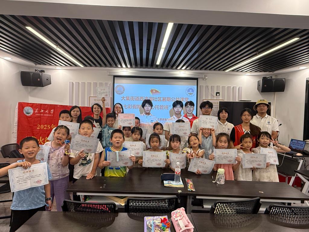 据了解,本次七彩假期 “爱心托管班” 共开设了书法、棋艺、红色教育、手工创作等十余类课程,服务社区儿童 20 余名。它不仅为孩子们提供了一个安全充实的假期选择,更通过多样化的活动培养了他们的兴趣特长与良好品格。结业不是结束,而是新的开始,地物学院萤火微光志愿服务队将把这份温暖与责任延续下去,让爱心与知识的光芒照亮更多少年的成长之路。