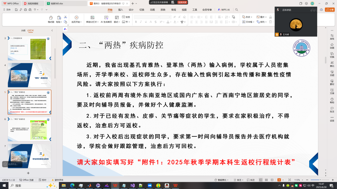 班会伊始,各班班长详细告知了同学们开学的具体时间以及秋季学期的时间安排,以便同学们更好地进行新学期规划。班会中,各班班长首先就开学报到时间、学期教学日历等关键节点进行了详细说明,帮助同学们提前做好新学期规划。随后,结合近期本地出现的基孔肯雅热和登革热病例,班会重点普及了虫媒传染病的传播途径、典型症状及预防措施,提醒同学们保持宿舍通风、清除积水、做好防蚊措施,及时报告异常情况。