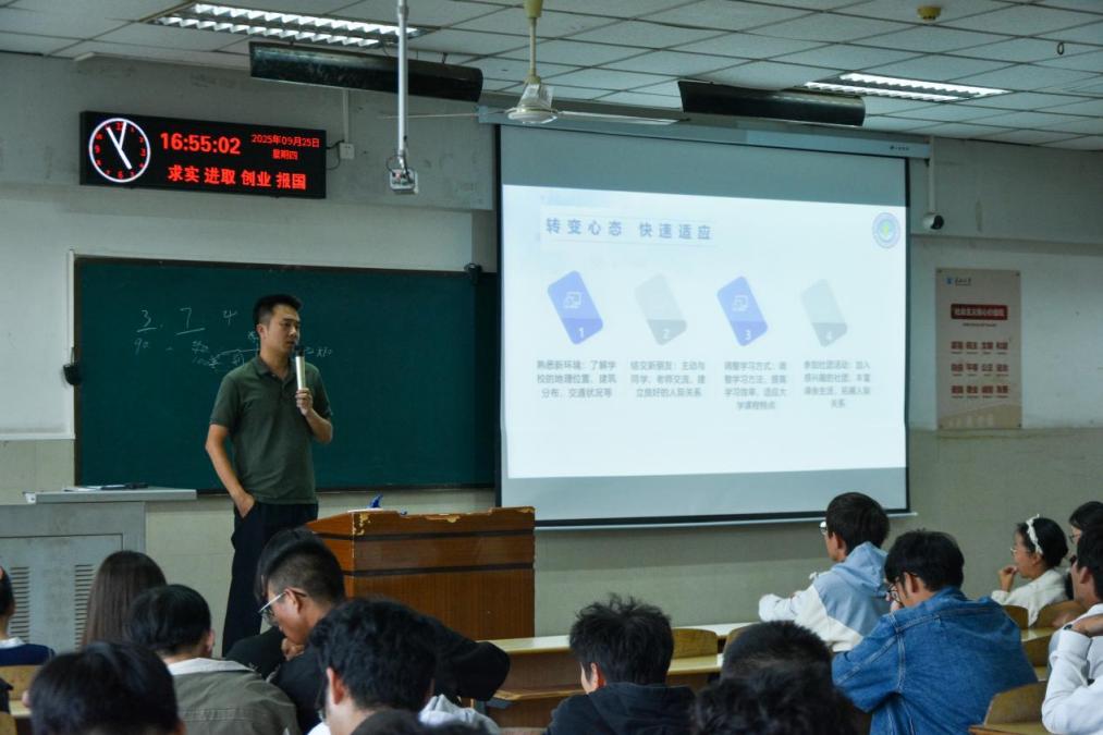 9月25日下午4时,荆州校区专场在12教203教室举行。2025级本科生辅导员谭辰阳老师以“转变心态,快速适应”为切入点,从熟悉新环境、结交新朋友、调整学习方式、参加社团活动等四个方面,为同学们讲述了具体的方法和技巧。他强调,要把“陌生环境”看作“成长契机”,把“暂时顿挫”视为“进步阶梯”,心态转变会带动行为的积极调整,适应过程也会随之顺畅,让“转变心态,快速适应”,的理念在同龄人中自然传递,形成互助成长的良好氛围。