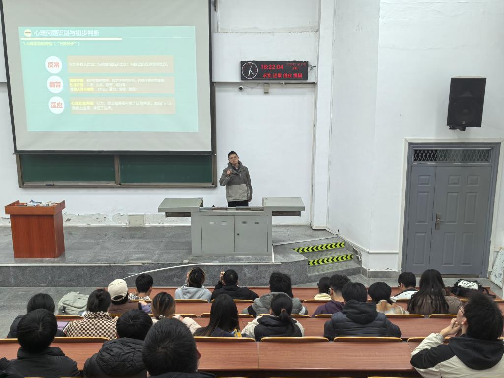 谭辰阳以“助人助己:心理咨询究竟是什么?”为主题展开系统讲解,从心理状态的评估方法入手,结合现实案例帮助学生识别心理困扰信号,掌握基础关怀技巧。在讲解心理咨询与心理治疗的区别时,他通过互动问答与案例解析,澄清“寻求帮助不等于有心理疾病”的误解,引导学生树立“主动求助是勇敢与智慧”的正确观念。此外,他还介绍了学校四级心理危机干预体系的运行机制,明确了学生骨干在心理支持网络中的责任与使命。