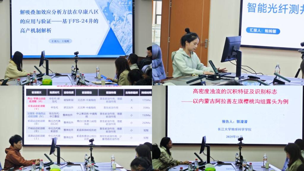 在智能技术与地学工程交叉领域,石油工程学院鲍婉馨同学系统介绍了智能光纤测井技术的原理、井下传感系统架构及现场应用案例,重点阐述了分布式光纤在高温高压环境下实现温度、压力等参数实时监测的技术优势与工程挑战,为油气井全生命周期数字化管理提供了有力支撑。地球科学学院罗洋同学围绕“断陷盆地大型断裂控热效应定量研究”,分享了雄安新区岩溶型地热系统的最新认识;郭濛濛同学则以“高密度浊流的沉积特征及识别标志”为题,结合典型露头实例,深入剖析重力流沉积体系的识别方法与地质意义,进一步拓展了对多尺度地质过程的理解。