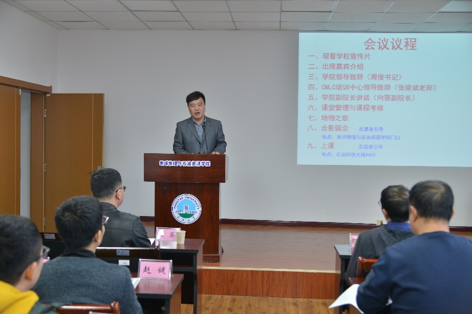 周俊代表学院致欢迎辞,向中油测井培训中心老师和学员表示热烈的欢迎,并向在座的各位领导和学员介绍了地物学院的发展历史和丰硕成果。他表示要认真组织,精心策划,为此次培训班工作开展提供最可靠的后勤保障和支持,期待以最好的教学质量和教学效果来完成此次培训,为石油测井领域人才培养做出贡献。