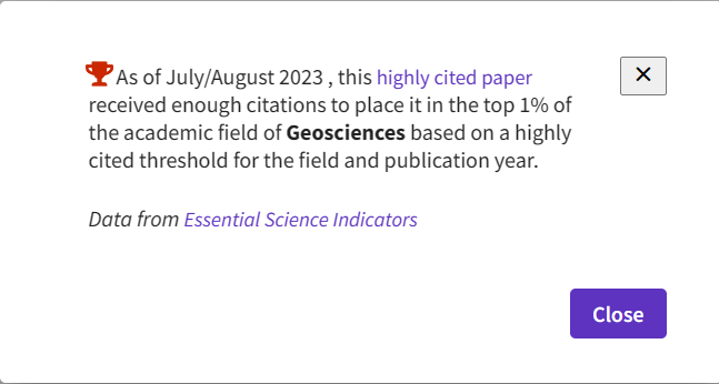 ESI是一种国际上用于评估科学研究绩效和跟踪科学发展趋势的关键分析工具。高被引论文是指按照同一年同一个ESI学科发表论文的被引频次排名位于全球前1%的论文,数据每两个月滚动更新一次。