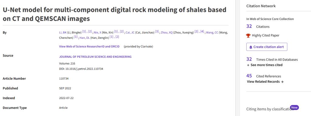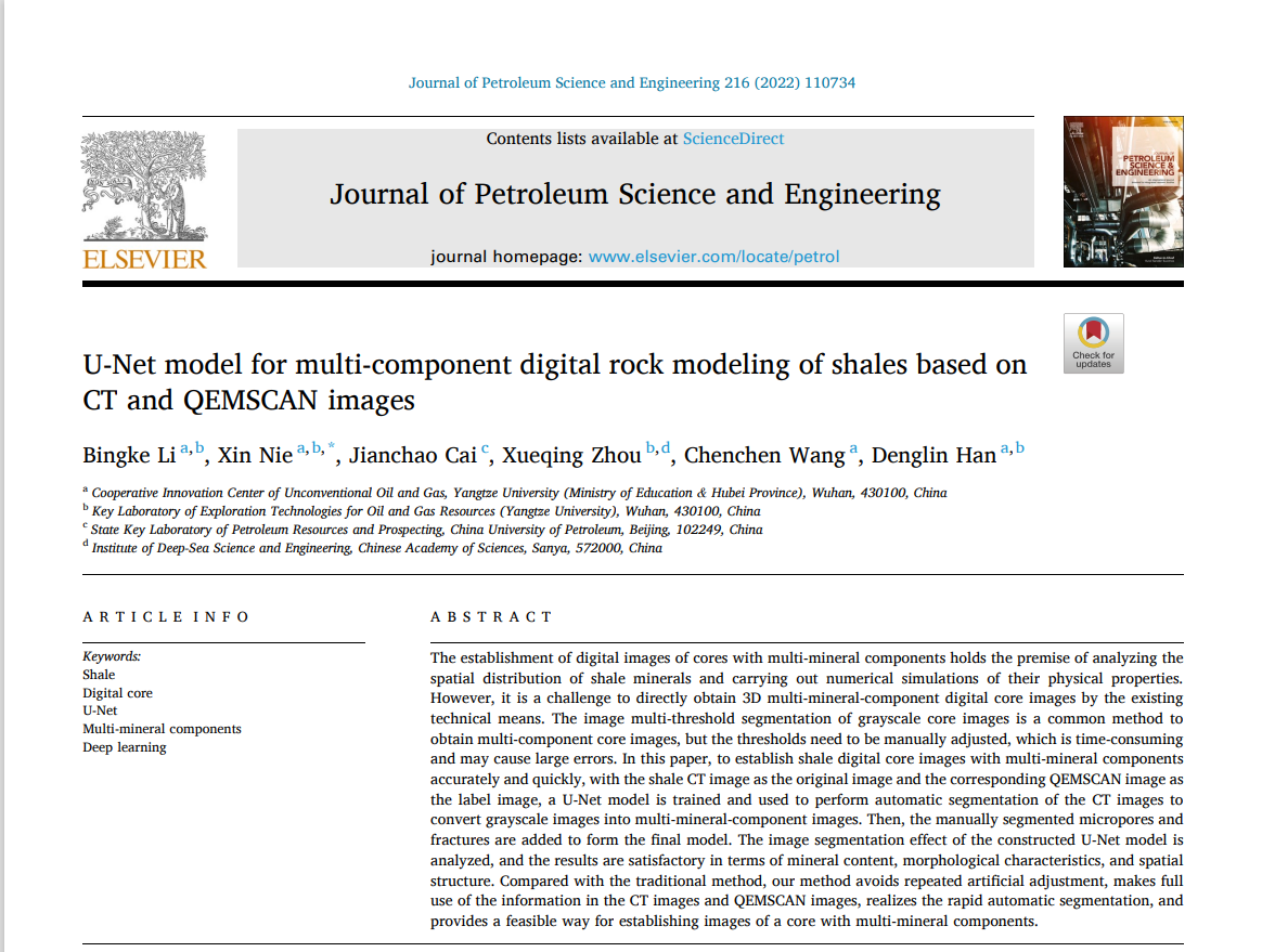 地物学院聂昕副教授作为通讯作者,其指导的硕士研究生李秉科作为第一作者,于2022年9月在石油一区TOP期刊《Journal of Petroleum Science and Engineering》发表了题为《U-Net model for multi-component digital rock modeling of shales based on CT and QEMSCAN images》的论文。该论文对包含矿物分布信息的二维QEMSCAN图像和三维CT灰度图像进行匹配,并基于U-Net网络进行训练,实现页岩CT灰度图像组分的精准分割,为页岩三维多组分数字岩心建模的难题提供了解决方案。截至目前,该论文在Web of Science数据库中被引用32次,据科睿唯安(Clarivate Analytics)集团《基本科学指标》(Essential Science Indicators,简称ESI)新一期统计数据显示,该论文进入地球科学领域的高被引论文之列。