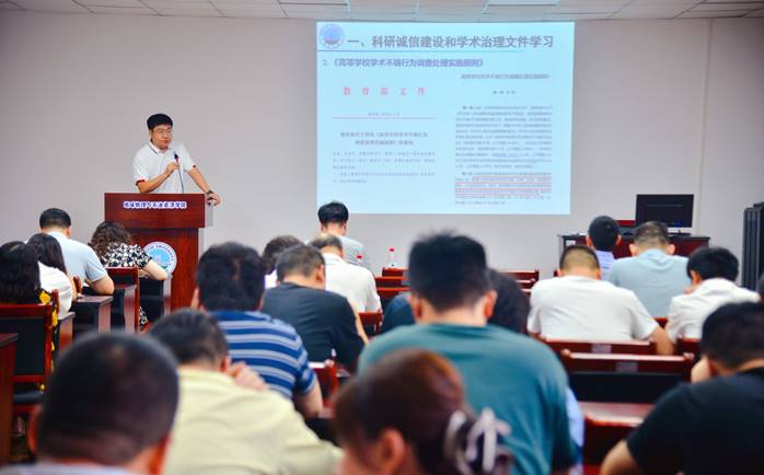 赵彬副院长(主持工作)做了科研、研究生相关工作汇报。领学了《教育部关于加强高等学校科研诚信建设和学术不端治理的指导意见》、《高等学校学术不端行为调查处理实施细则》等文件精神;公布了今年上半年科研考核完成情况,科研经费到账1773万元,新增纵向项目5项、横向项目8项;发表高水平论文24篇,取得国家专利授权6项,等等;介绍了科研团队组建情况、石油与天然气工程一流学科建设经费使用情况,以及研究生招生和培养情况。