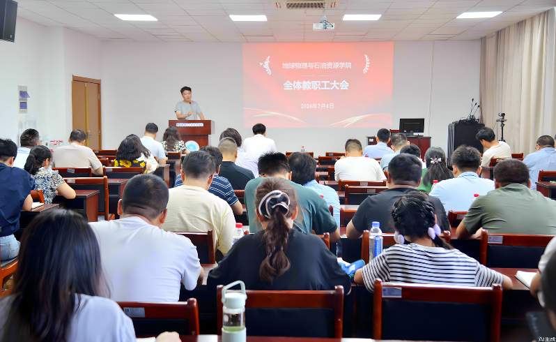 (通讯员 余为)7月4日下午,我院在石油科技大楼A405会议室召开暑假前全院教职工大会,会议对学院近期重点工作进行了汇报,对暑期注意事项作了温馨提示,学院领导班子及全体教职工出席会议,会议由学院党委书记周俊主持。