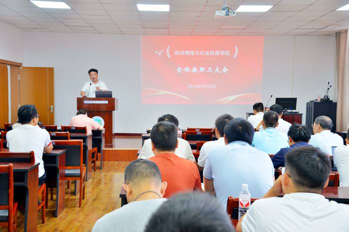 (通讯员 余为)9月26日下午,我院在石油科技大楼A405学术会议室召开了全院教职工大会,院党委书记周俊同志主持会议。
