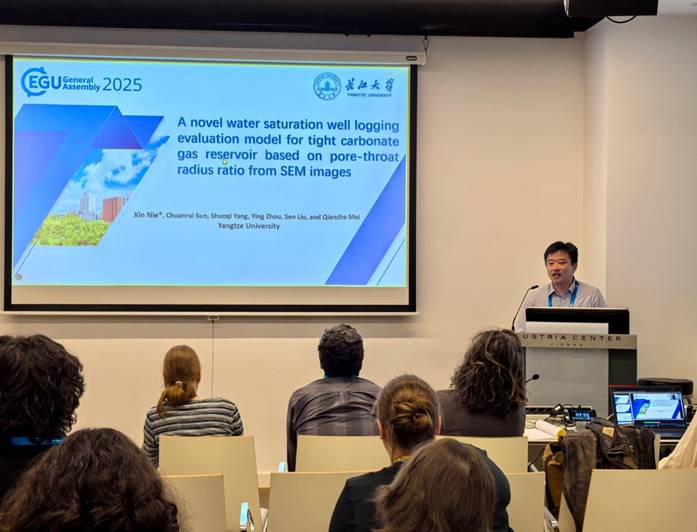 我院教师聂昕教授和张宫副教授参加了本次会议。聂昕教授在“Advances in Petrophysics and Rock Physics: Integrating Models, Experiments, and Field Geophysics Across Scales for Geo-Reservoir Studies”专题作了题为“A novel water saturation well logging evaluation model for tight carbonate gas reservoir based on pore-throat radius ratio from SEM images”的口头报告,受到了国内外同行专家学者的关注;张宫副教授作为“Low field NMR techniques-theory, instrument, and application in geosciences”专题的召集人,与国内外专家学者进行了广泛交流。两位老师的参会扩大了长江大学的知名度及在国际地球物理专业领域的影响力。通过本次会议中听取同行报告以及面对面交流,对岩石物理、数字岩心、碳酸盐岩及复杂岩性储层、机器学习等方向的最新研究进展进行了跟踪与了解。