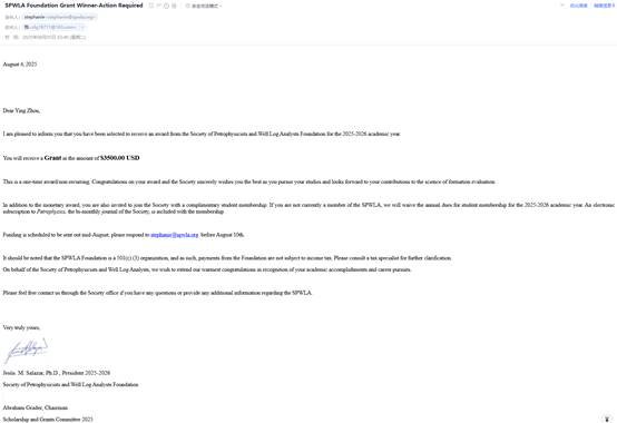 (通讯员 万宇)近日,经国际岩石物理学家和测井分析家学会(Society of Petrophysicists and Well Log Analysts, SPWLA)评定,我院测井信息工程系聂昕教授领衔的非常规储层测井评价与动态监测技术团队的2024级博士研究生周迎获2025-2026学年科研资助3500美元。
