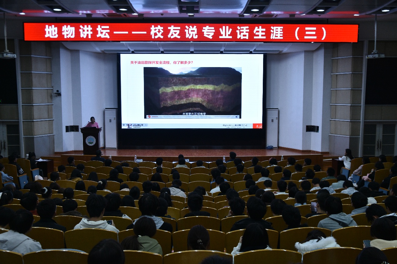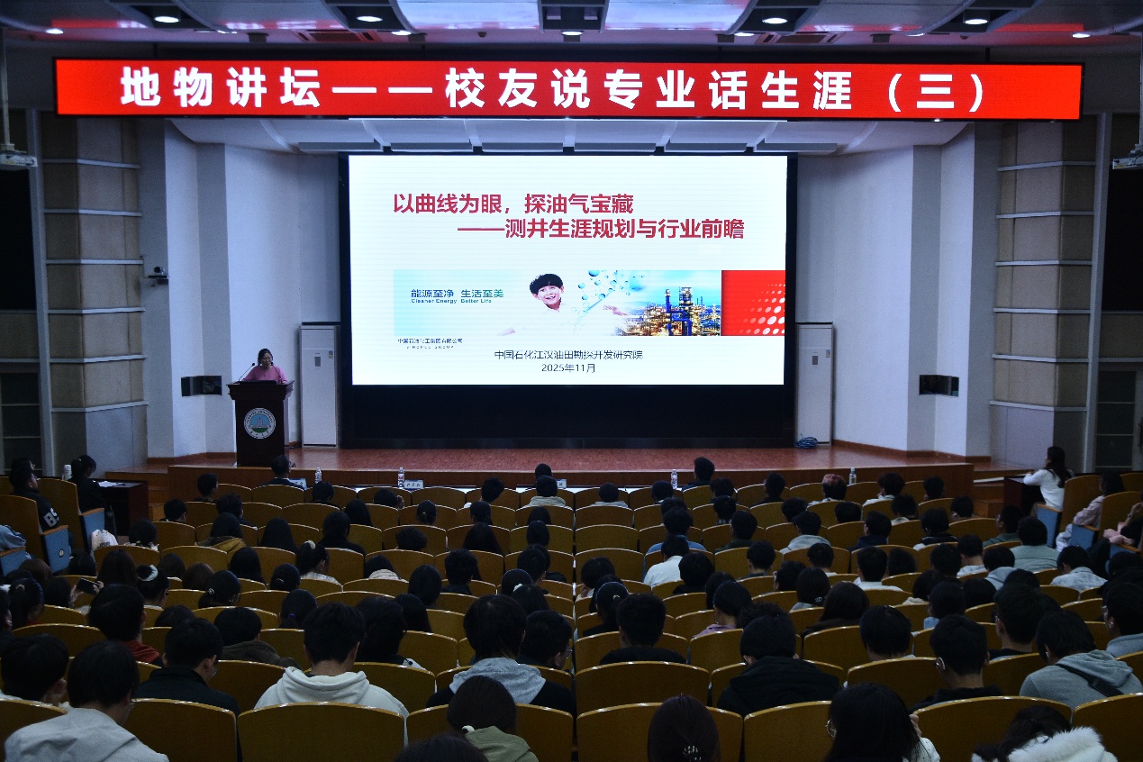 (通讯员 刘雅芬 管朕东)为帮助2025级新生深入了解专业前沿与行业发展趋势,科学规划学业与职业生涯,1126日晚,地物学院在东校区12405报告厅举办地物讲坛校友说专业话生涯报告会第三讲。中石化江汉油田分公司勘探开发研究院高级工程师、学院2006届校友曾芙蓉应邀作题为“以曲线为眼,探油气宝藏”的主题报告。报告会由学院党委副书记焦简金主持,测井信息工程系副主任申波、2025级辅导员谭辰阳、田二燕及全体2025级本科生参加报告会。