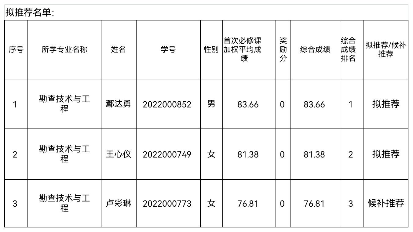 根据学校《长江大学推荐优秀应届本科毕业生免试攻读硕士学位研究生管理办法》(长大校发〔2025〕9号)、《关于做好推荐2026届优秀本科毕业生免试攻读硕士学位研究生工作的通知》和《地球物理与石油资源学院专项推荐2026届优秀本科毕业生免试攻读硕士学位研究生工作方案》要求,经学生本人申请,学院资格审核,学院推免生遴选专家审核小组和学院推免生遴选工作小组审议,现将我院申请 “国防科工招生单位接收外校推免生”专项计划拟录取名单予以公示。在公示期间,若拟推荐学生不符合条件或放弃推免资格,则依据候补人选的排名由候补人选依次递补。公示时间:2025年9月13日—9月15日。