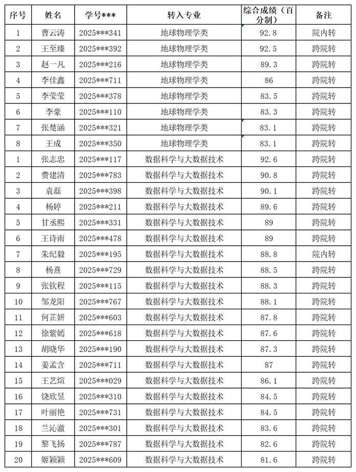 根据《长江大学普通本科生专业分流与转专业管理办法(试行)》(长大校发 [2019] 260号)精神以及本科生院《关于开展2025级普通本科生春季学期转专业工作的通知》要求,结合地物学院2025级本科生转专业工作方案的具体安排,我院考核小组于2026年3月12日对2025级本科学生转专业资格审核通过学生进行了面试。综合必修课成绩和面试成绩,经学院党政联席会讨论通过,现将拟转入学生名单予以公示,公示时间为2025年3月13日至2025年3月14日。