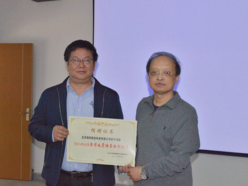 其次,他介绍了北京瑞码恒杰科技有限公司拥有完全自主知识产权软件——Seismark:主要用于叠前地震反演、叠前裂缝检测研究。并给地物学院捐赠了一套价值180万元的Seismark软件,用于人才培养和科学研究。副院长毛宁波教授代表学院主持了软件捐赠仪式。