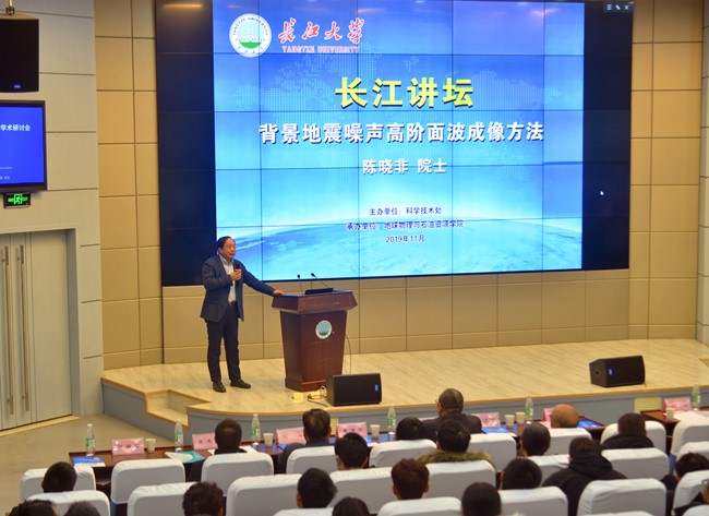 随后,作为“长江讲坛”第41讲主讲人,中国科学院院士、南方科技大学讲席教授陈晓非以“背景地震噪声高阶面波成像方法”为题,给与会人员带来了一场高水准的学术报告。“地震面波或背景噪声层析成像方法由于仅用基阶频散曲线反演,无法解决非唯一性问题 “陈院士报告围绕高阶振幅对面波成像或背景噪声成像的重要性、如何从背景噪声中提取高阶振型的频散曲线及高阶频散曲线对反演成像的改进三个问题,通过大量严谨详实、对比清晰的数据模型及曲线分析,逐层递进,细致全面地解析了背景噪声高阶面波成像这一新方法理论。陈院士的精彩报告激发起现场师生对相关研究领域的浓厚兴趣,他们与陈院士就“背景噪声高阶面波成像对地质勘探的意义”、“背景噪声在石油勘探领域中的应用“、“非线性反演的计算方法”等话题进行了互动交流。报告结束后,学生代表为陈院士敬献了鲜花,校长冯征为他颁发了水晶材质的“长江讲坛杯”。