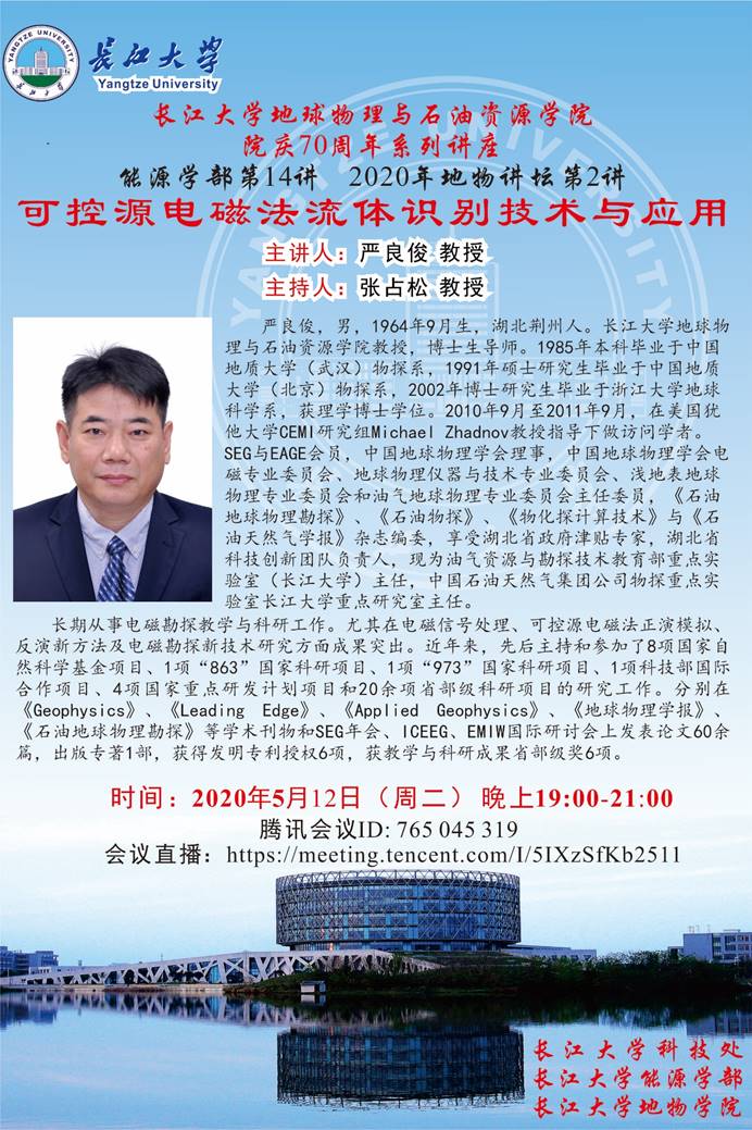 2020年5月12日19点,长江大学地球物理与石油资源学院严良俊教授以“可控源电磁法流体识别技术与应用”报告拉开了院庆70周年系列线上讲座的序幕。该讲座同时也是能源学部第14讲。