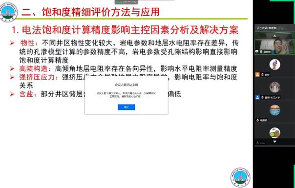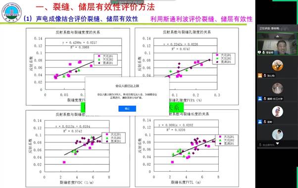 章成广教授以塔里木油田为例,首先分析了致密砂岩储层面临的储层构造复杂、储层物性较差和(微)裂缝发育等导致的测井储层评价难题,然后主要针对(微)裂缝属性参数和有效性评价难题、储层流体类型识别难题和储层有效性评价难题分别给出了相应的解决方案并展示了各方案的应用效果,向大家分享了长江大学声波测井实验室章成广教授团队近年来的最新研究成果。此次线上讲座吸引了国内众多高校院所及石油、地矿及煤田等单位的关注,线上直播会议室长时间处于300人的上限满员状态。讲座取得极大成功,扩大了长江大学地球物理与石油资源学院岩石物理与测井综合评价研究团队在国内外的影响力。讲座结束后多所高校及企事业单位同行对章成广教授课题组的相关研究成果表示了肯定,并希望尽早加强全面合作与交流。