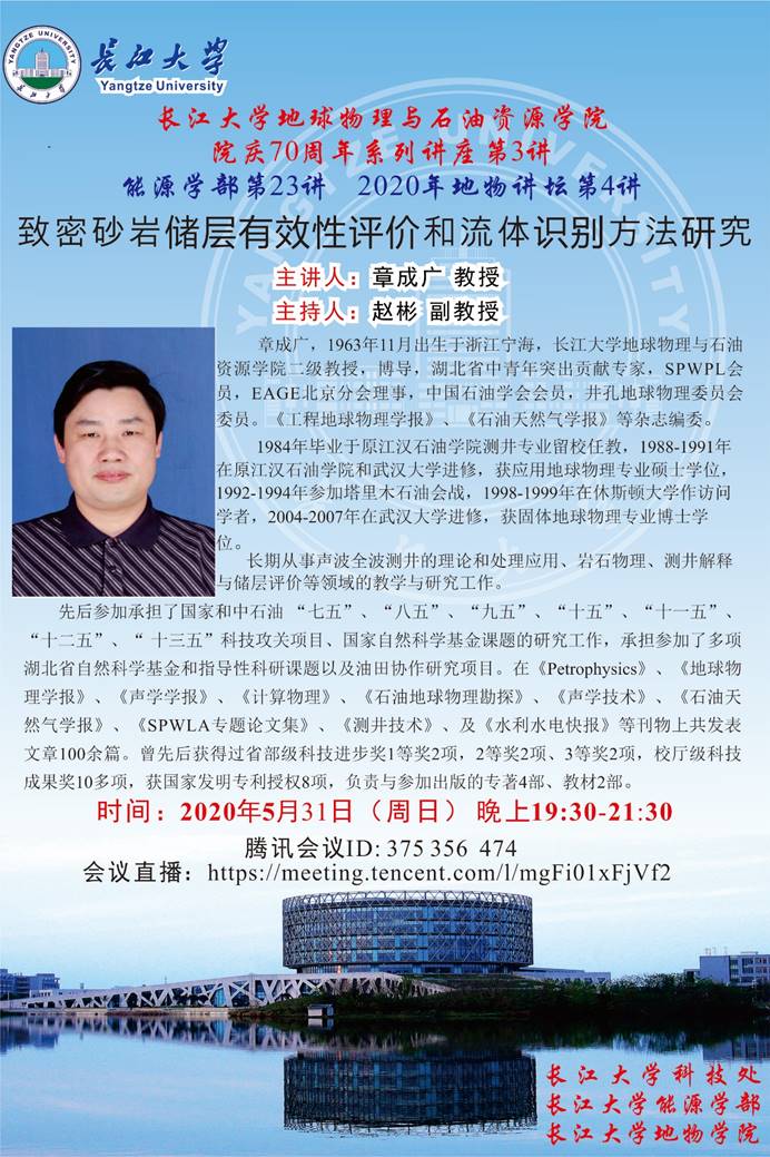 2020年5月31日19:30,长江大学地球物理与石油资源学院章成广教授题为“致密砂岩储层有效性评价和流体识别方法研究”的院庆70周年系列线上讲座第3讲准时开讲,并取得圆满成功。该讲座同时也是能源学部第23讲。