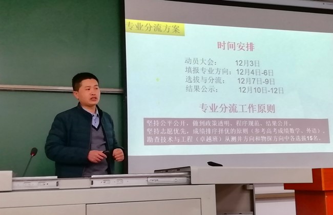 12月3日晚,我院在武培B105教室召开了专业分流动员大会。张占松院长和唐新功、陈雪菲、杨修伟、秦喜林、赵振龙等教师,以及2019级地物类全体学生参加了大会。会议由彭晓波副院长主持。